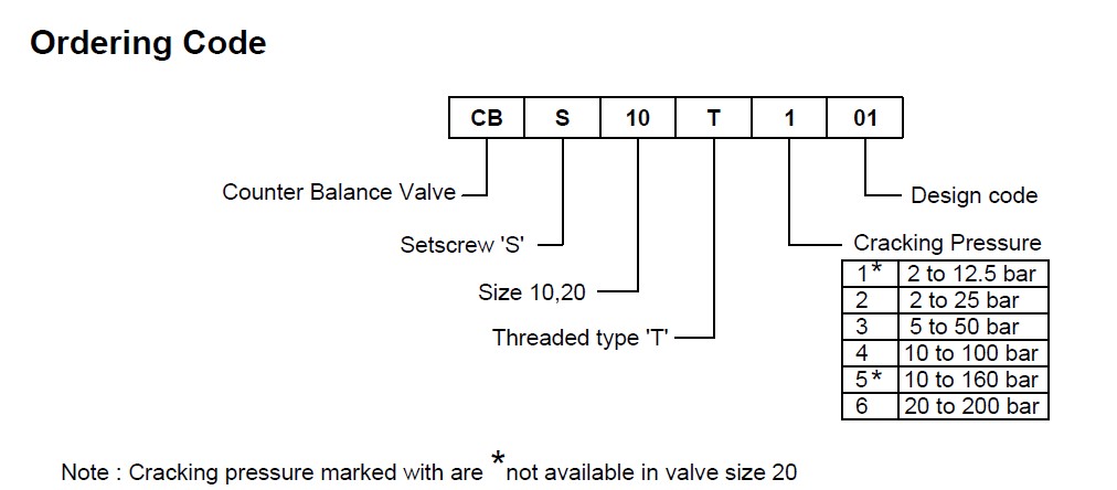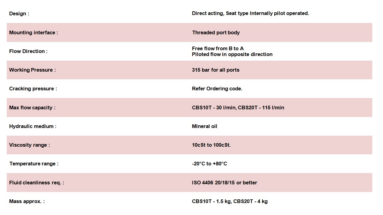 Counter Balance Valve CBS*T are seat type valves. They offer free flow from port A to port B and give leak free clousure in opposite direction upto a predetermined cracking pressure. The predetermind cracking pressure can be adjudted within its maximum specified range.